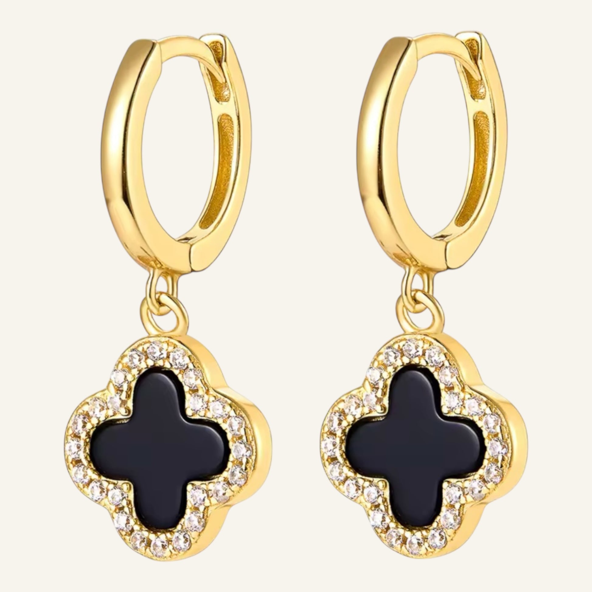 Each hoop features a delicate clover drop framed with shimmering pavé accents, symbolizing harmony, protection, and balance. Thoughtfully crafted for movement and comfort, their 24 mm total drop offers a graceful presence — subtle yet beautifully noticeable.
