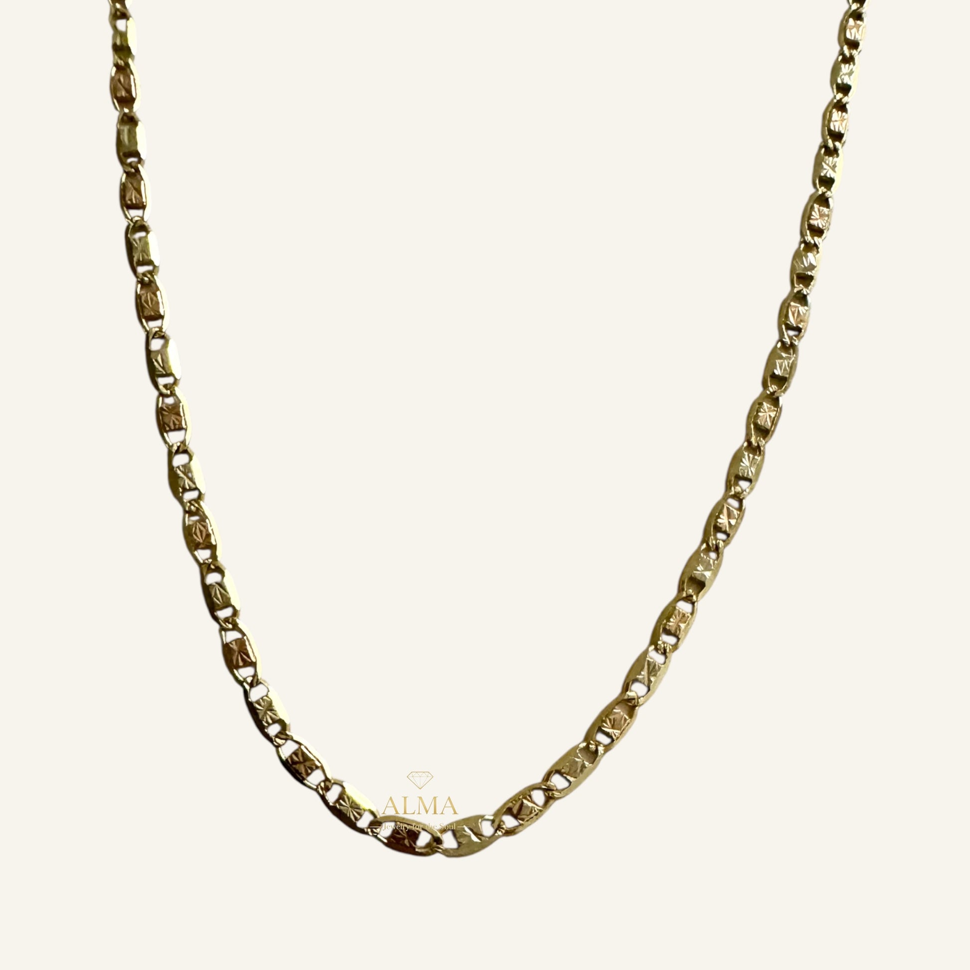 Delicate yet luminous, the Valentina Lumière Chain is crafted in solid 14K tri-color gold, blending yellow, white, and rose tones into one radiant silhouette.